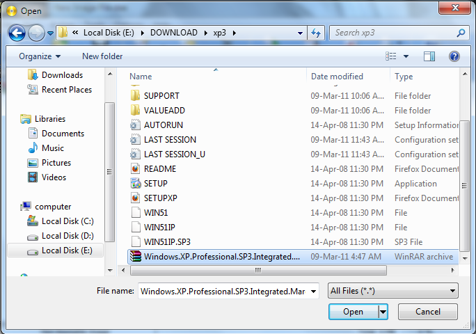 Previously to the new dialog box that appears on the next to 'File Name' change to 'All Files'. Scroll the mouse down and at the very buttom click the option 'ALL Files' then navigate to the folder where the ISO file 'XPSP3' save it.